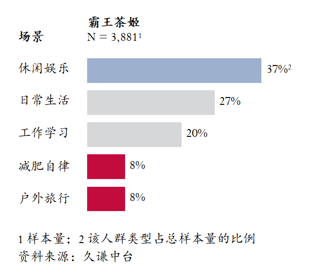 霸王茶姬深度渗透多元消费场景,核心聚焦休闲社交与日常生活两大领域。休闲娱乐活动中,消费者倾向于在春季和周末与朋友聚会、拍照打卡,品牌可通过举办主题活动增强社交属性。在日常生活中,霸王茶姬成为社交饮品和庆祝选择,尤其在女性节日和天气变暖时,品牌可加强与节日和社交场合的关联。在工作学习环境中,霸王茶姬被上班族和学生群体广泛接受,品牌可满足提神和缓解压力的需求。在旅行户外探险中,消费者在自然环境中享用饮品,品牌可结合户外活动进行营销。在减肥自律期间,消费者选择霸王茶姬作为健康饮品,品牌可强化其在减肥市场的定位。